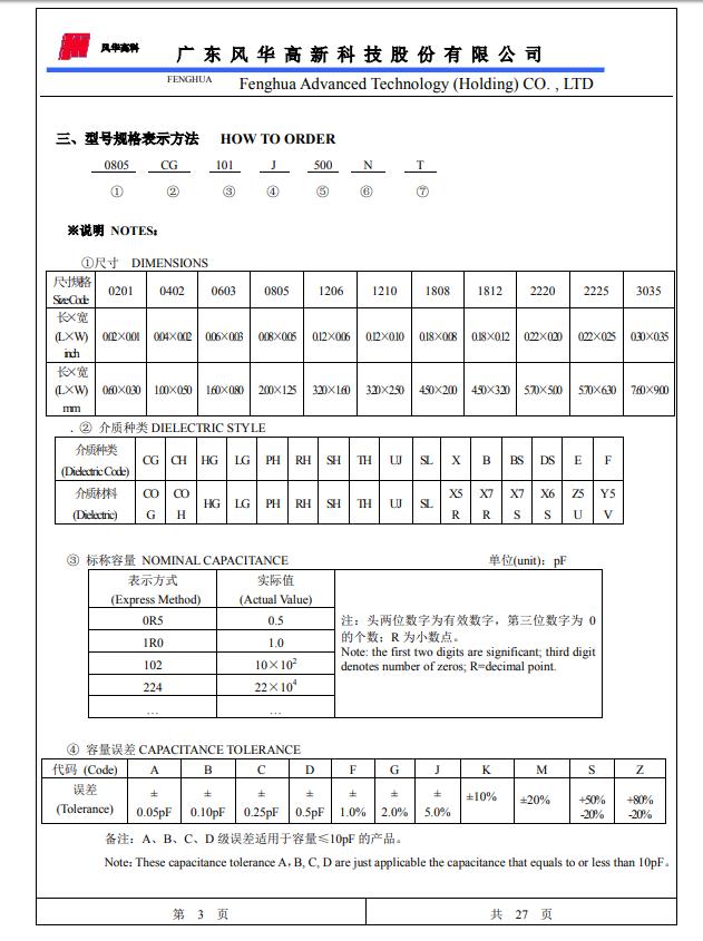 4、容量误差精度代码: F(±1%)、G(±2%)、H(±3%)、J(±5%)、K(±10%)、C(±0.25pf)、B(±0.10pf)、D(±0.50pf)